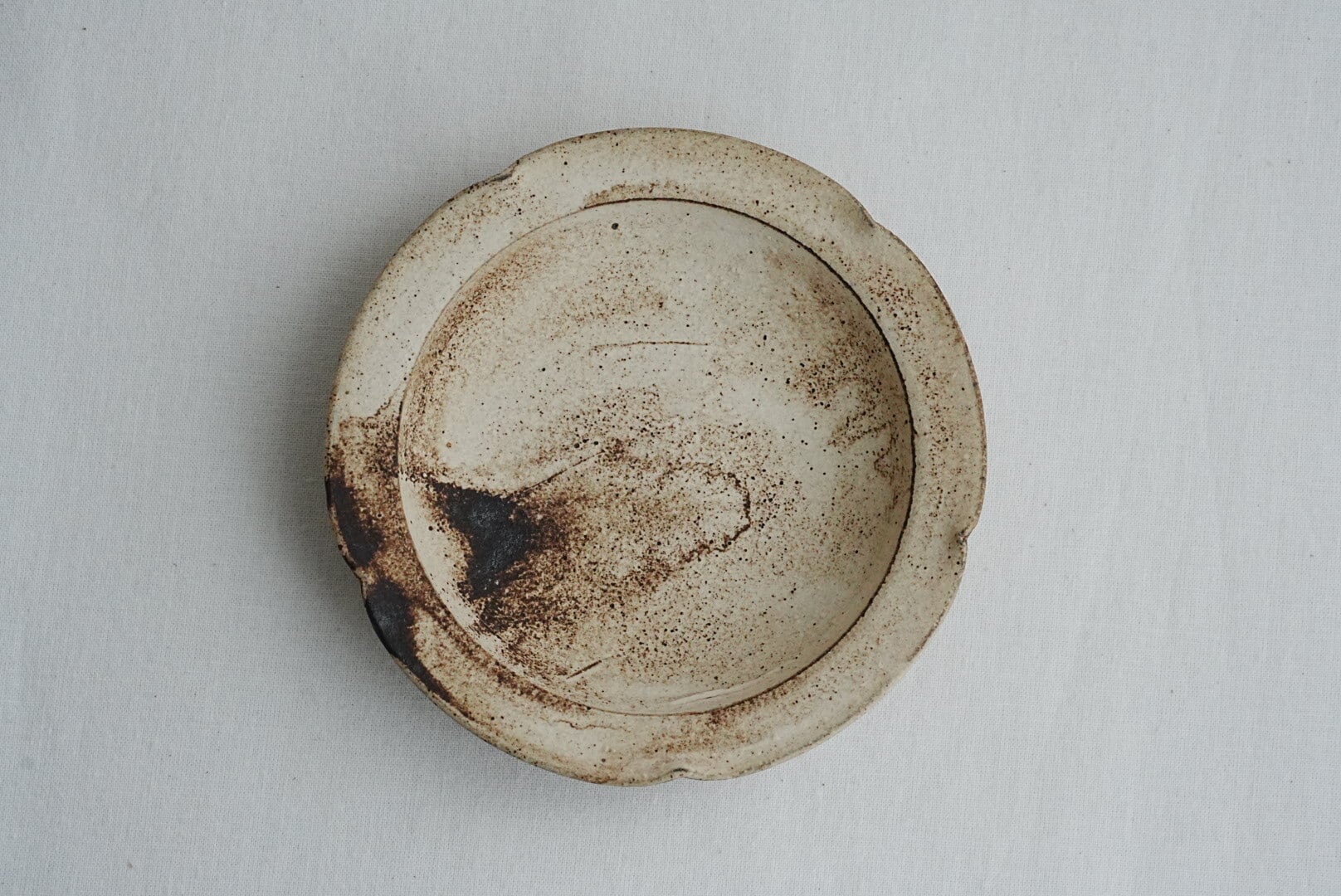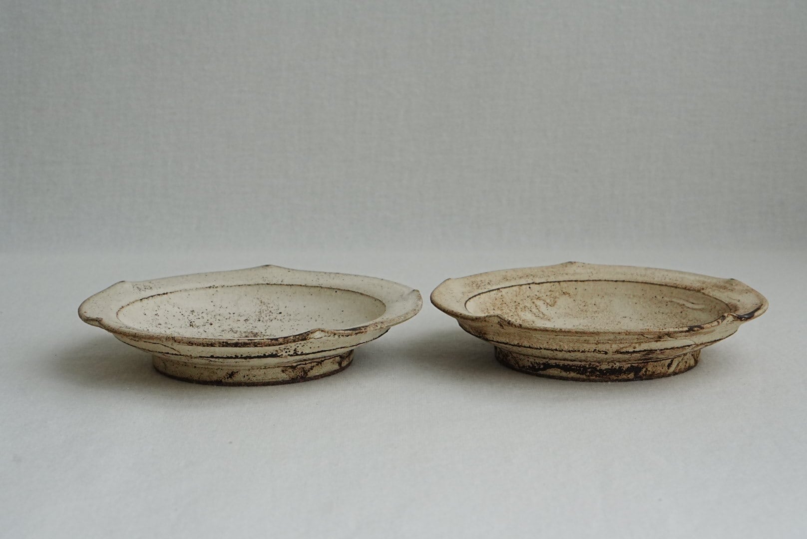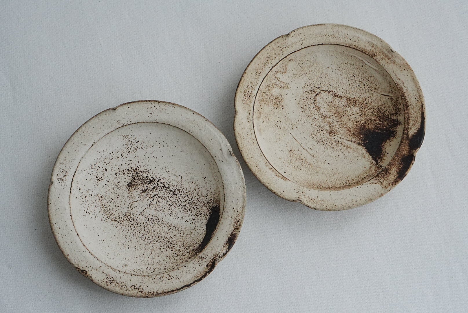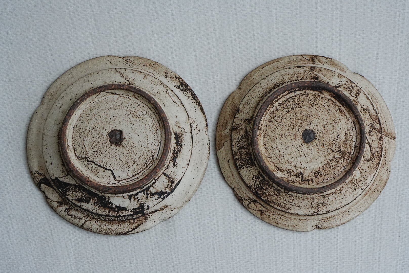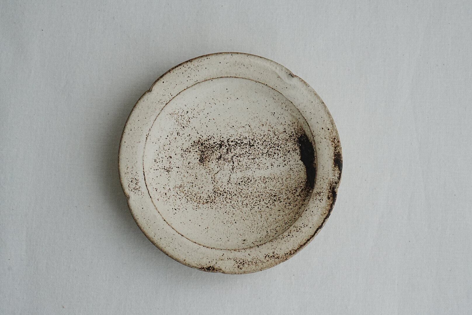 白色の泥漿を焼き付けたあと、黒色の泥漿を流し掛けて模様を描いています。