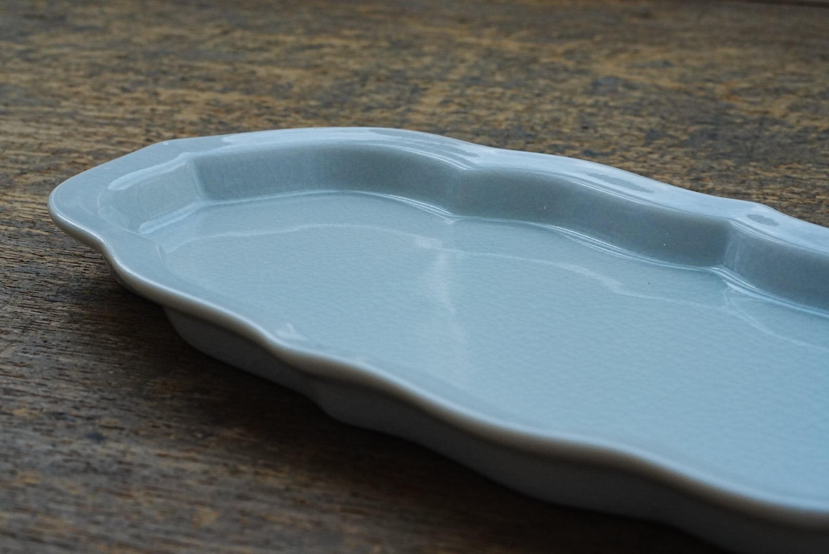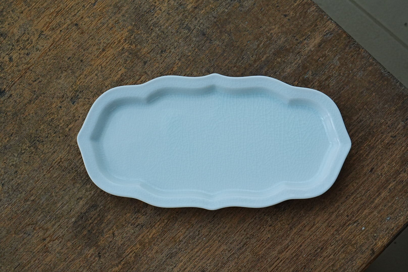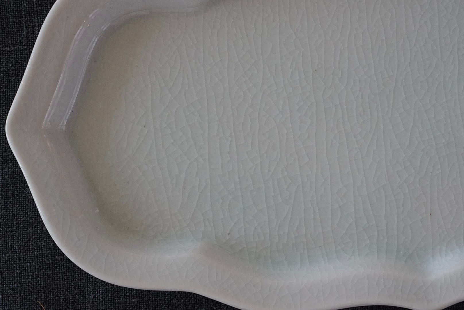 九谷焼の有名な五彩色絵の磁器とは違う、器本来の美しい形にも目が届くよう無地にした「KATA KUTANI / 型九谷」。窯元の型から生まれた隅切角、ツバ形、八角モッコ、菊、桔梗、稜花などの昔ながらの形を、絵を入れない釉に細かいひびの入った「貫入」だけにすることで豊かな表情と落ち着いた雰囲気のあるラインに仕上げています。形を楽しめ、盛り付ける料理が映える普段使いの九谷の器をお楽しみください。
