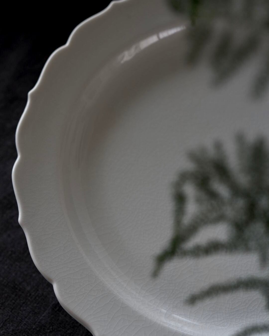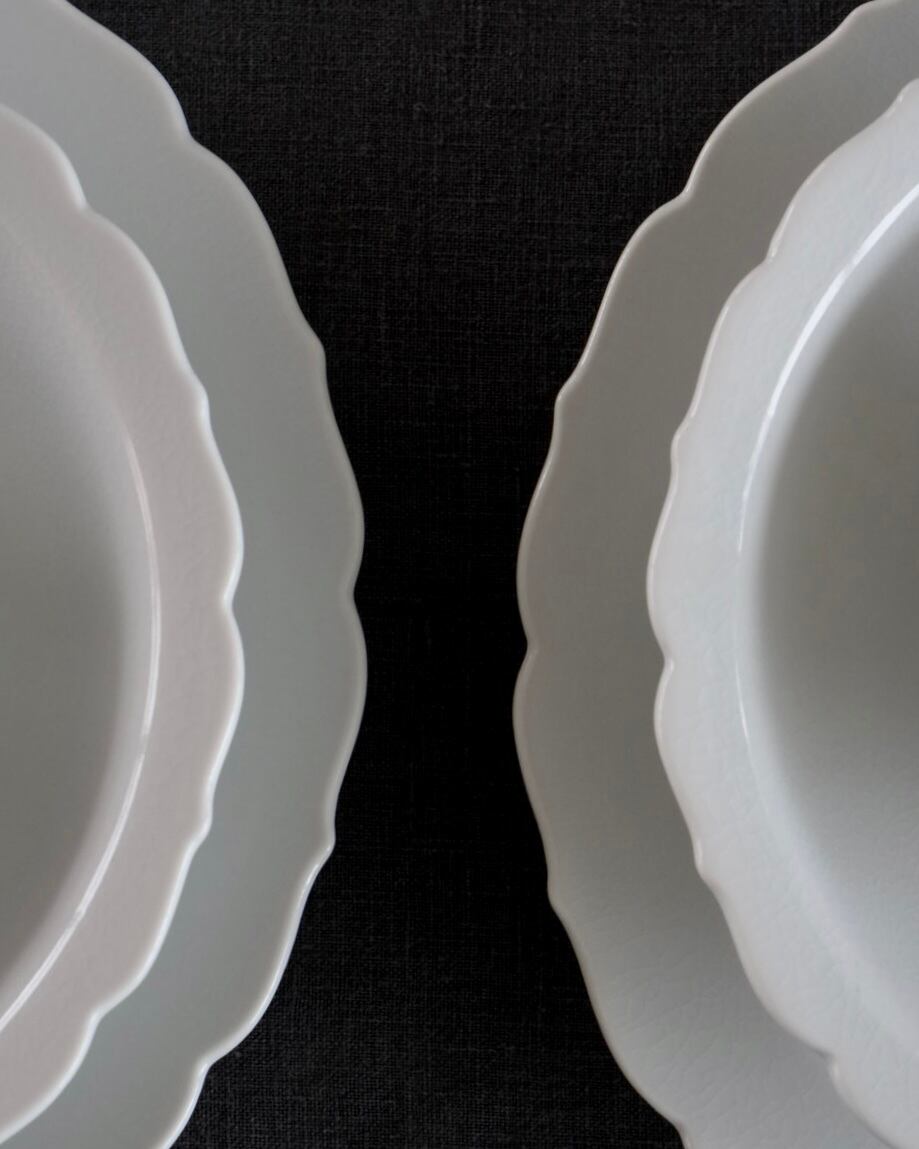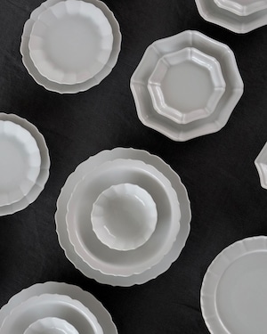 九谷焼の有名な五彩色絵の磁器とは違う、器本来の美しい形にも目が届くよう無地にした「KATA KUTANI / 型九谷」。窯元の型から生まれた隅切角、ツバ形、八角モッコ、菊、桔梗、稜花などの昔ながらの形を、絵を入れない釉に細かいひびの入った「貫入」だけにすることで豊かな表情と落ち着いた雰囲気のあるラインに仕上げています。形を楽しめ、盛り付ける料理が映える普段使いの九谷の器をお楽しみください。