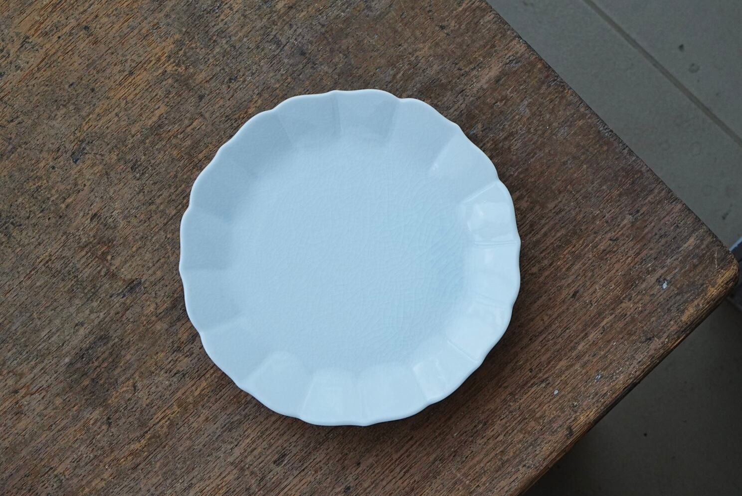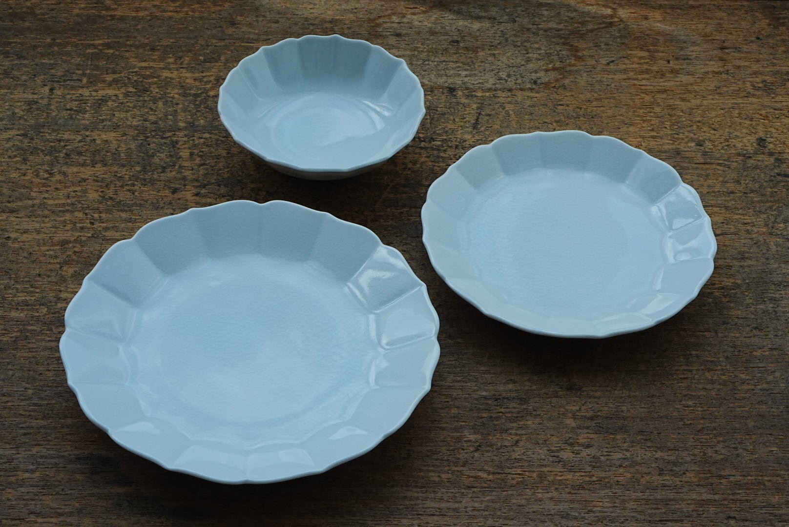 九谷焼の有名な五彩色絵の磁器とは違う、器本来の美しい形にも目が届くよう無地にした「KATA KUTANI / 型九谷」。窯元の型から生まれた隅切角、ツバ形、八角モッコ、菊、桔梗、稜花などの昔ながらの形を、絵を入れない釉に細かいひびの入った「貫入」だけにすることで豊かな表情と落ち着いた雰囲気のあるラインに仕上げています。形を楽しめ、盛り付ける料理が映える普段使いの九谷の器をお楽しみください。