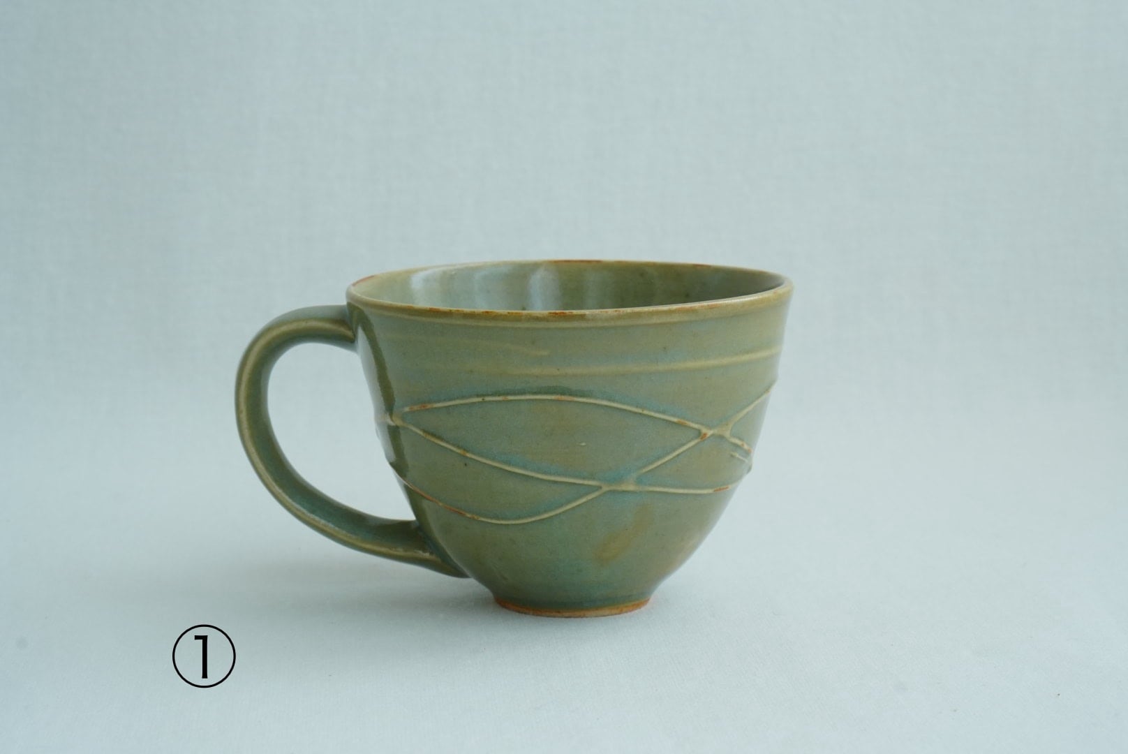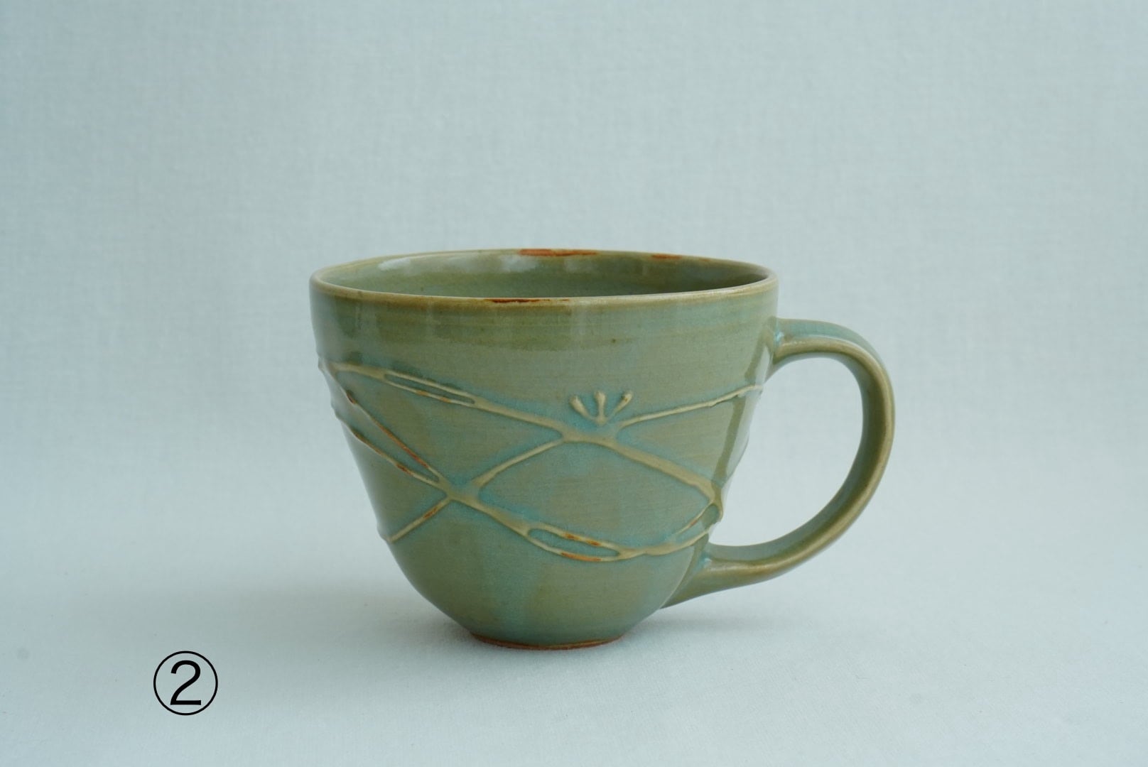 のびやかなイッチンの模様で装飾されたマグカップ。